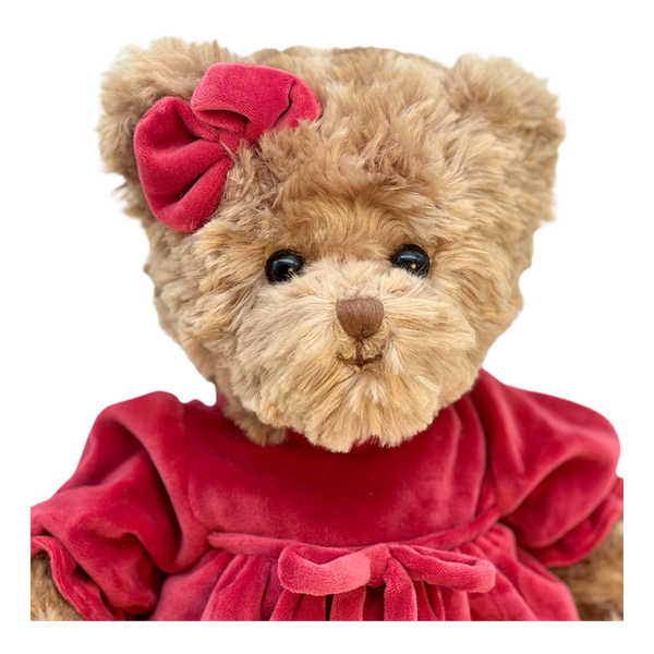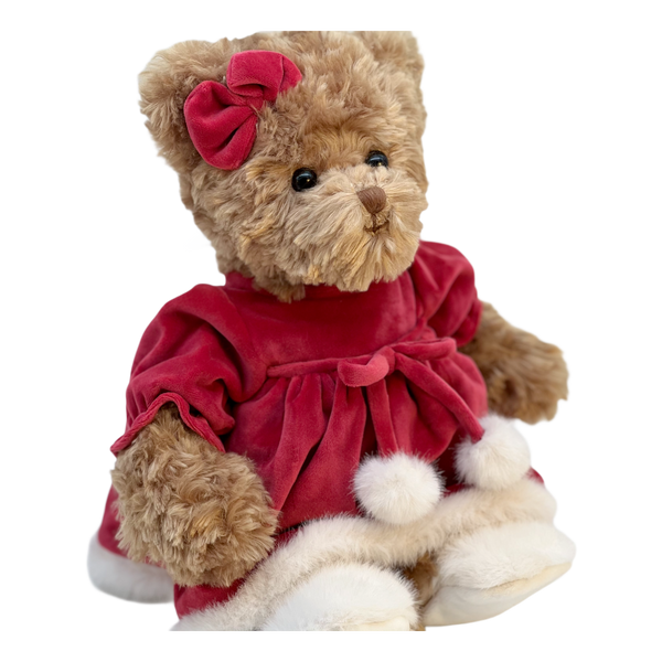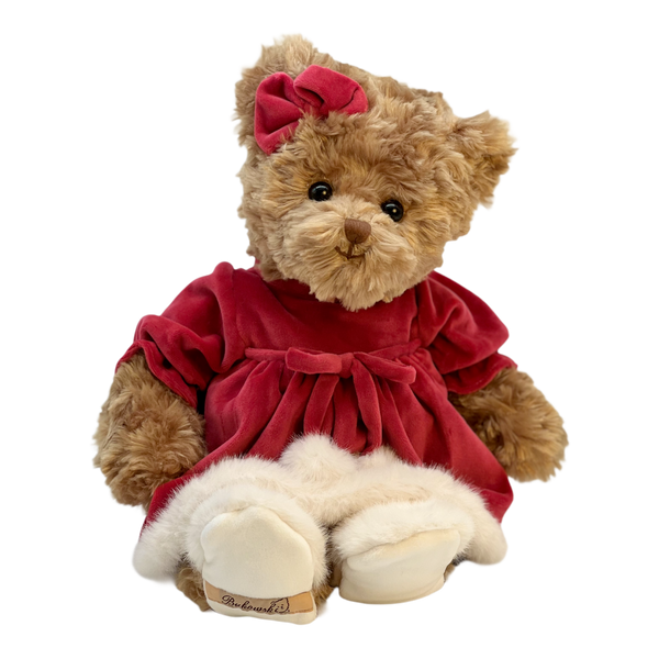 Ein bezauberndes Teddybären-Mädchen erobert die Herzen zur Weihnachtszeit. Gefertigt aus herrlich weichem, camelfarbenem Plüsch lädt sie zum Kuscheln ein. Sie trägt ein elegantes Samtkleid in festlichem Bordeauxrot, das mit seiner pelzigen Umrandung perfekt zu den winterlichen Feiertagen passt. Auf ihren Füßchen hat sie flauschige, weiße Pantoffeln, die den Look liebevoll abrunden. Eine edle Samtschleife am Ohr verleiht ihr den letzten Hauch von Eleganz – ein traumhaftes Geschenk und ein echtes Sammlerstück. Der Teddybär ist mit kindersicheren Augen ausgestattet und kann bei 30 °C in der Maschine gewaschen werden.